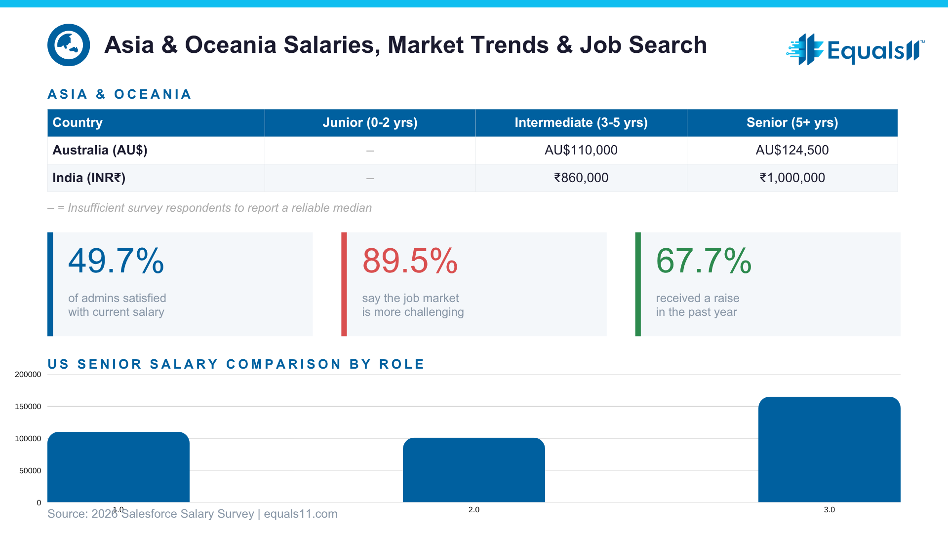According to the latest salary survey, a senior Salesforce Admin in the US now earns a median salary of $110,100. In Australia, that figure is AU$124,500. In the UK, senior admins report a median of £57,588.