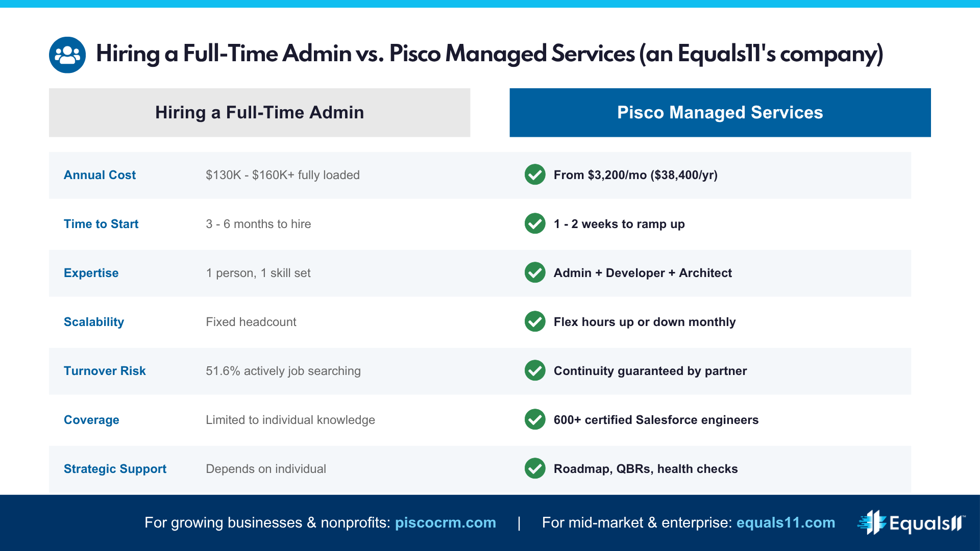 The salary survey data makes a clear case: the cost of supporting Salesforce internally is going up, and the expectations are getting harder to meet with a single hire. Managed services offer a different path, one that gives you broader expertise, faster access to talent, and more predictable costs.For small businesses and nonprofits looking for the same level of expertise at a leaner price point, Pisco offers Continuum Hypercare managed services starting at $3,200 per month. You’ll get the same 600+ certified engineer talent pool, the same delivery standards, and the same strategic approach, just sized for smaller teams and faster timelines.