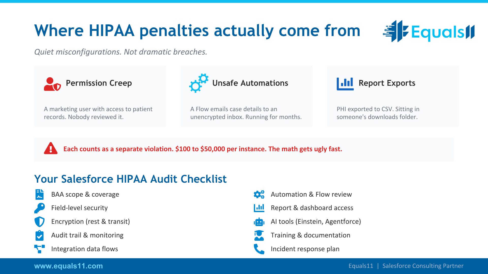 If you want a structured review with someone who has done this across dozens of healthcare Salesforce orgs, Equals11 runs org audits that include HIPAA compliance as part of the scope. Permissions, encryption, data flows, automations, AI tools. We review the full environment and give you a prioritized punch list of what to fix first.